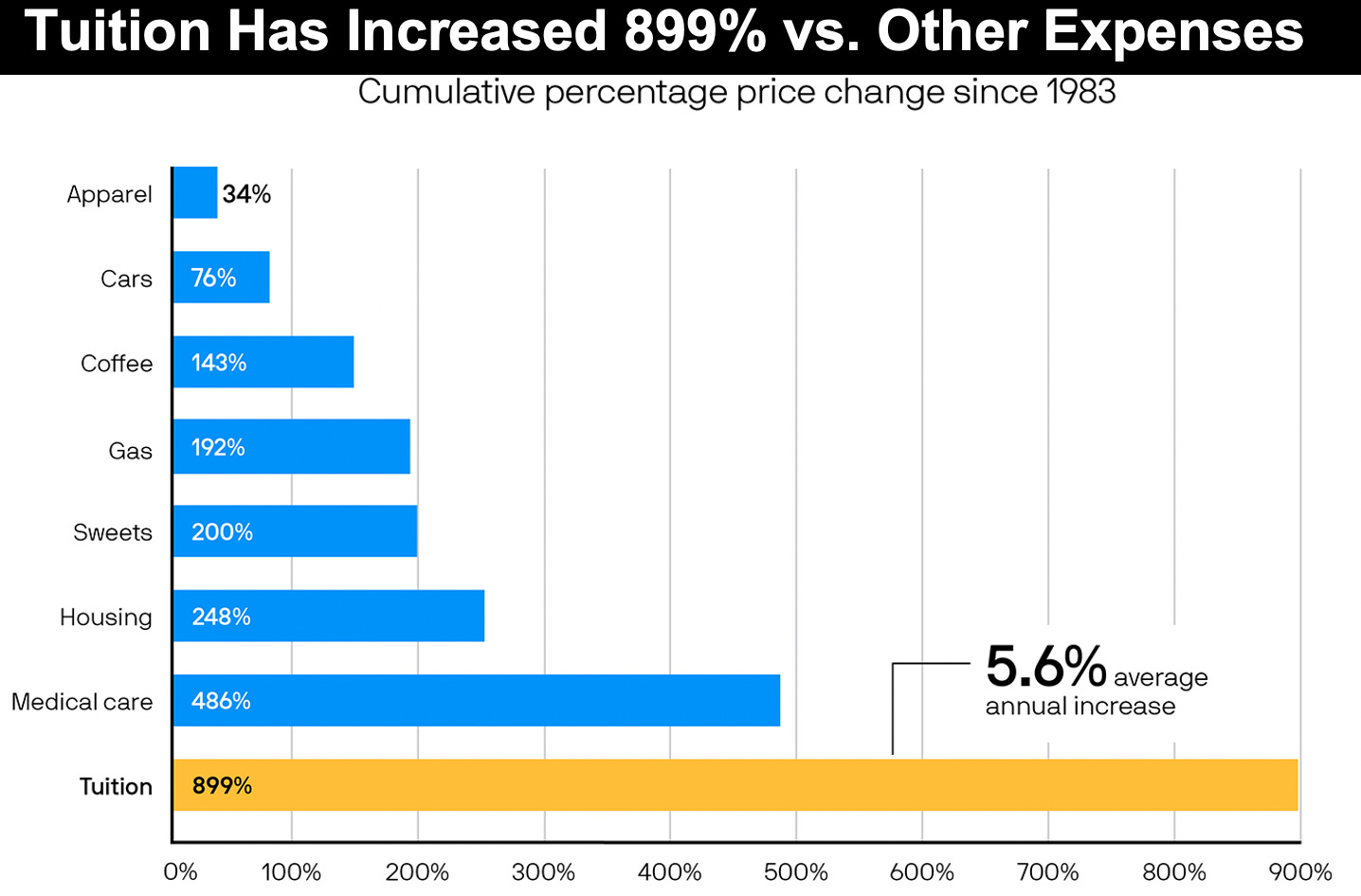 Tuition is up 899% since 1983, saddling 42 million borrowers with $1.8 trillion in debt—second only to mortgages