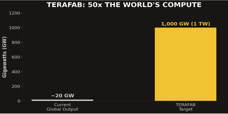 For the last decade, AI progress has been throttled by one thing: compute. Not ideas. Not talent. Not capital. Compute. Terafab doesn’t just ease that constraint… it obliterates it. When you go from 20 gigawatts to 1 terawatt, you’re not uncorking a bottle. You’re removing the bottle entirely. Every AI lab, every startup, every researcher on the planet gets access to orders of magnitude more processing power. The models that follow will make GPT-4 look like a pocket calculator.